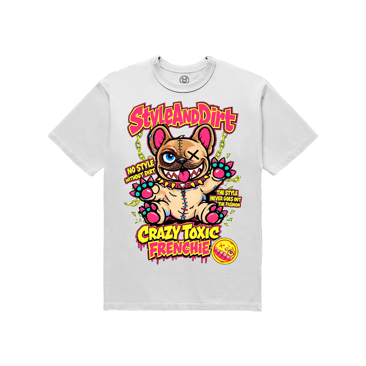 A Crazy Toxic Frenchie kollekció a StyleAndDirt egyik legkarakteresebb világa. A design egy őrült, vigyorgó frenchie figurát jelenít meg, amely egyszerre játékos, vagány és kicsit provokatív.